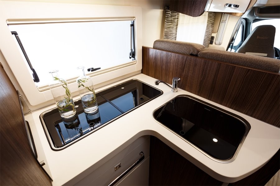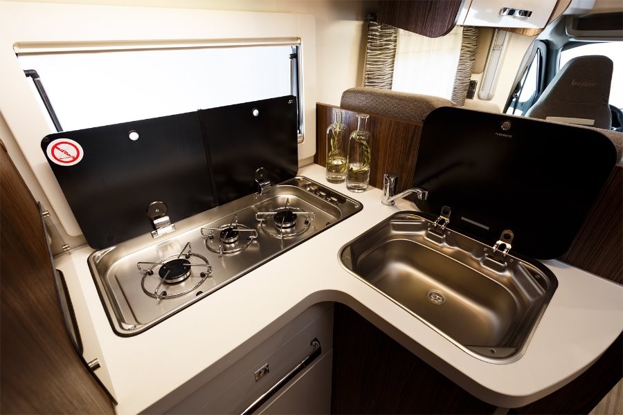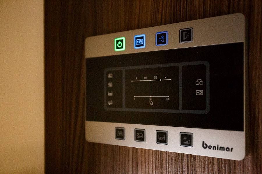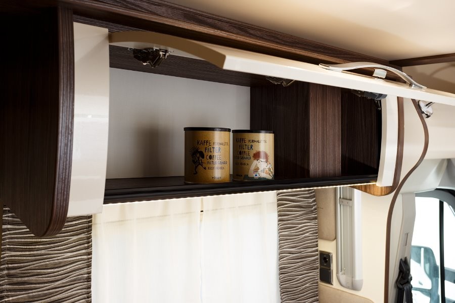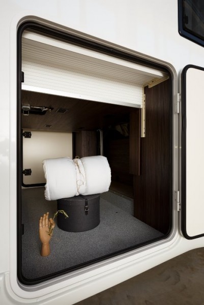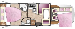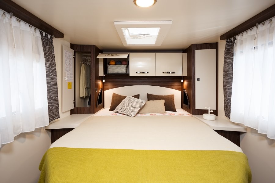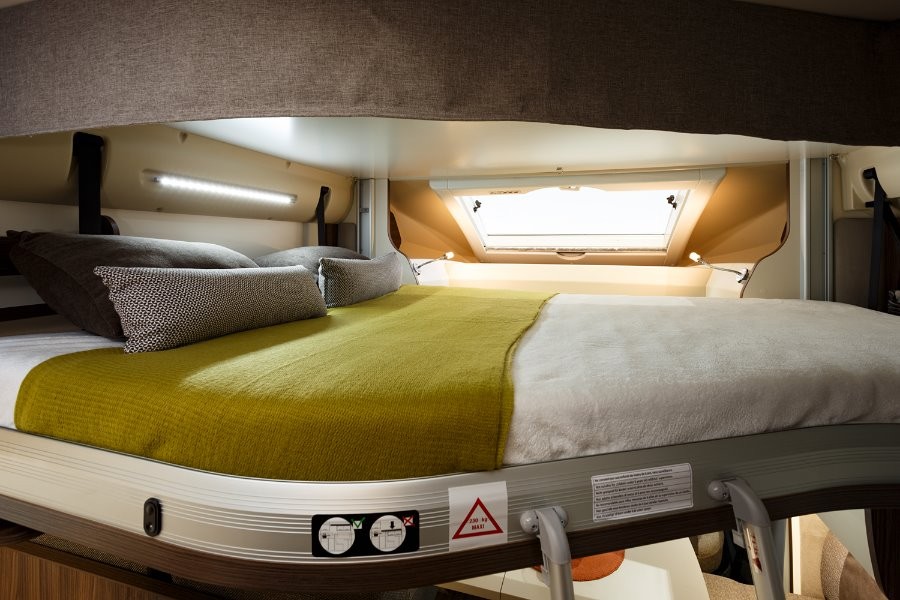 dwie oddzielne sypialnie: z tyłu duże dwuosobowe łóżko, w części mieszkalnej elektrycznie opuszczane dwuosobowe łóżko, dodatkowo na rozłożonych kanapach w części stołowej łóżko pojedyncze.